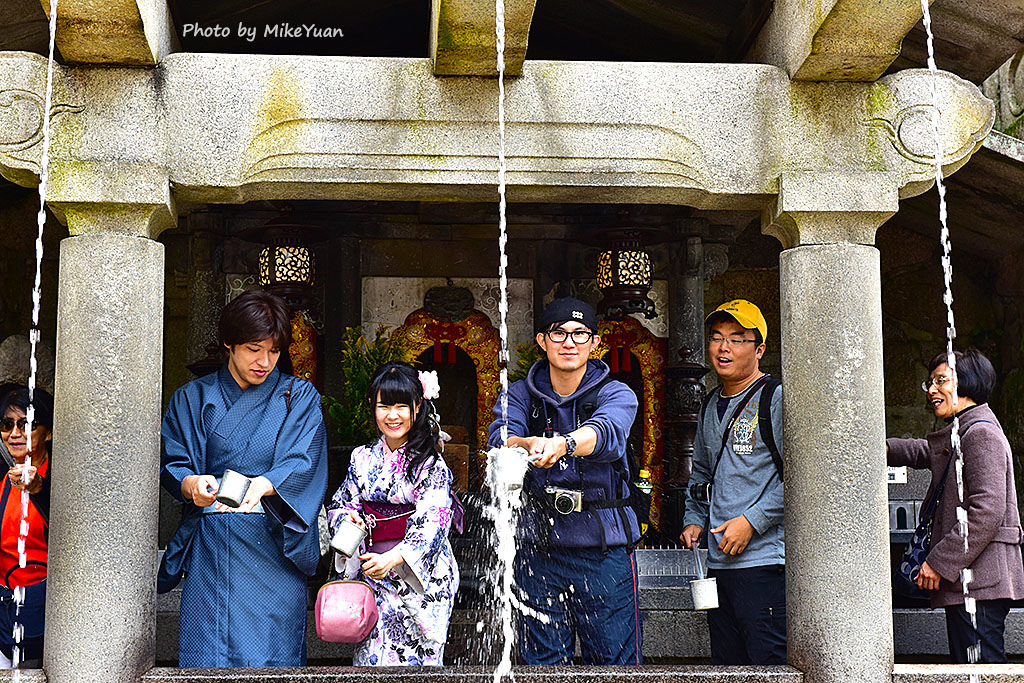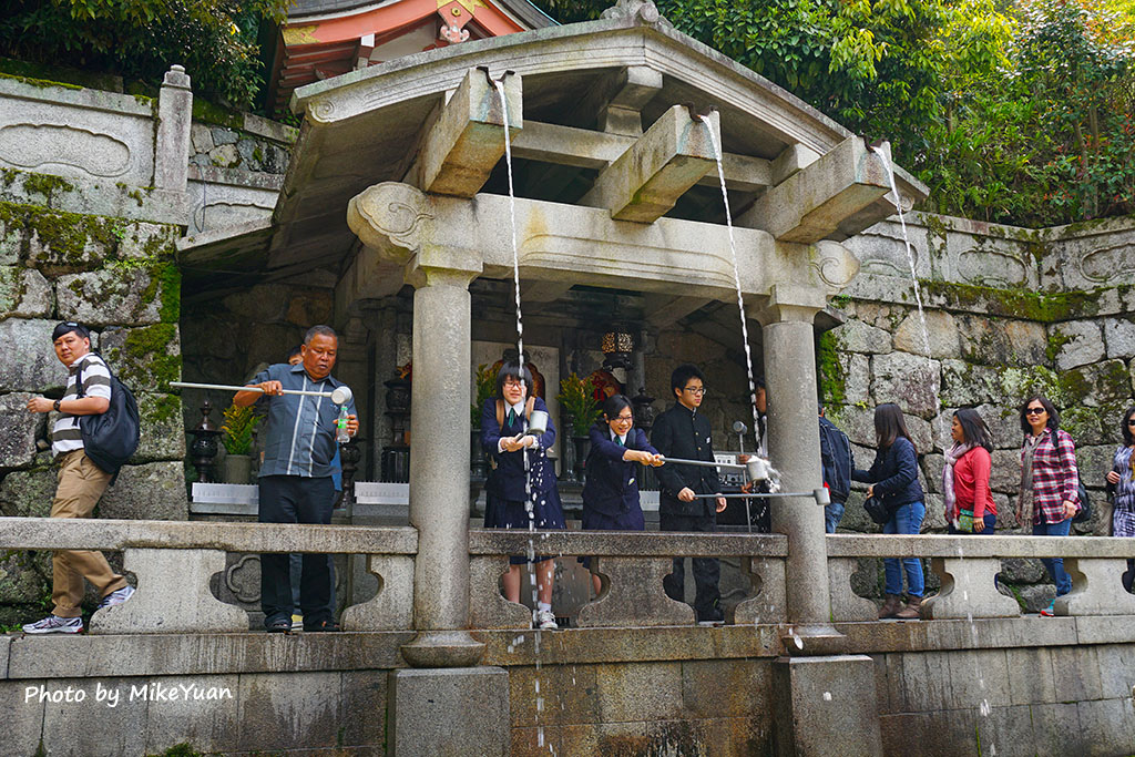 而在清水寺正殿廁旁下有個山泉水瀑,順著音羽山湧出,數千年來延綿不斷,其名為「音羽瀑布」(音羽の滝)。